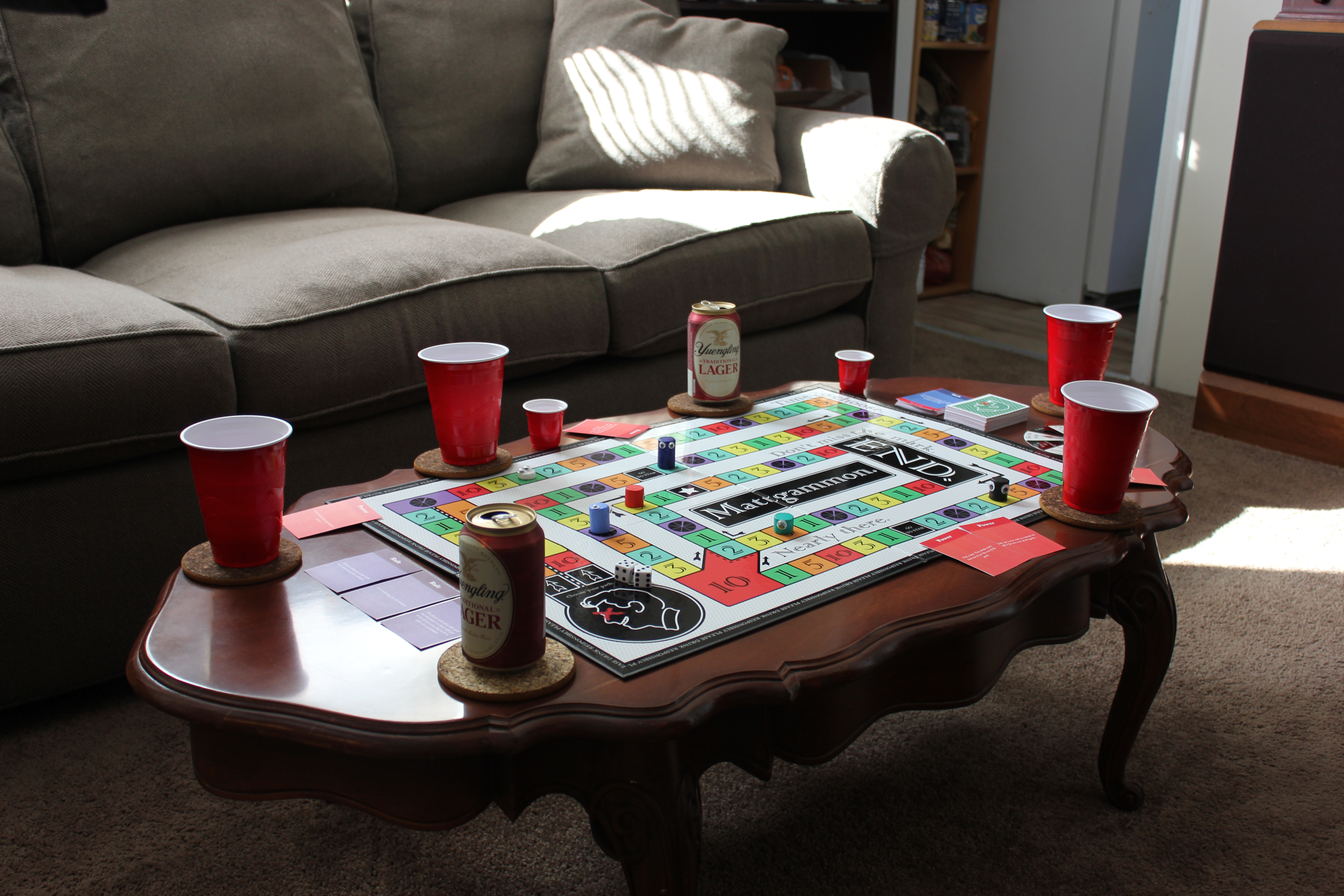 Mattgammon is the tentative name for a drinking board game I've been designing since college. The game's development has ocurred in many short bursts over a period of more than three years, during which time the exact rules, appearance, and content of the game has changed many times.